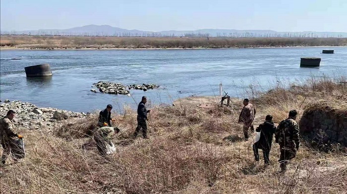 一水廠職工在江邊撿拾垃圾